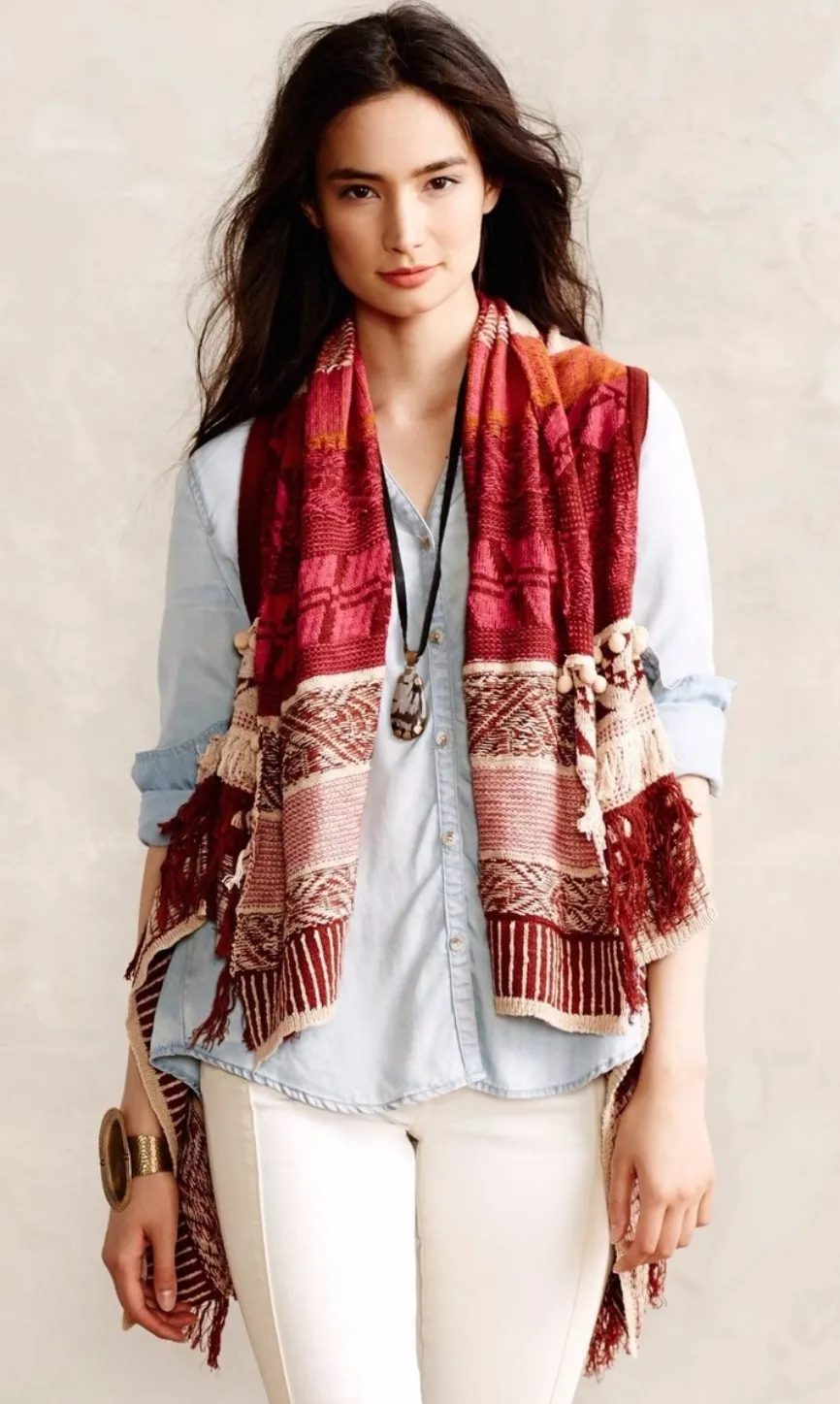 A striking oversized patchwork knit vest cardigan showcasing a vibrant array of colors and textures. This piece features an open front design with dramatic fringe detailing along the hem and sides, adorned with playful pom-pom accents. The intricate knit patterns create a unique visual interest, making it a standout addition to any wardrobe. Perfect for layering over dresses or tops for a chic, bohemian-inspired look. Ideal for casual outings, weekend brunches, or adding a touch of artistry to your everyday style. Type: Poncho Outer Shell Material: Cotton Blend Style: Kimono Department: Women Theme: Bohemian Accents: Fringe, Beaded Features: Lightweight Fabric Type: Knit Pattern: Geometric Insulation Material: Wool Season: Fall, Spring Occasion: Casual Sleeve Length: Sleeveless Unit Type: Unit Keywords: MOTH vest, knit cardigan, patchwork design, bohemian style, fringe detail, pom poms, oversized vest, textured knit, layered fashion, unique apparel, artistic clothing, casual chic, festival wear, designer vest • Approximate measurements are in photos. • Smoke free/pet friendly home. • I ship out in 1-2 days. • Thank you for shopping my closet.