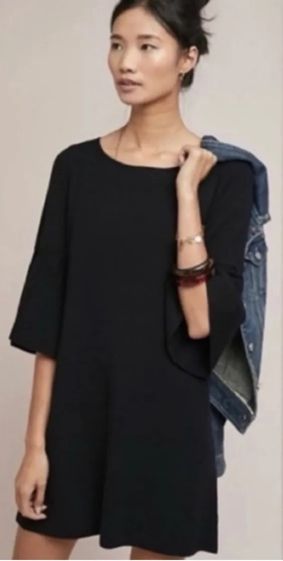 Moth by Anthropologie knit mini dress in black. This stylish dress features elegant bell sleeves and a flattering silhouette, perfect for transitioning from day to night. Its versatile design makes it ideal for casual outings or a chic evening event. Type: Knit Department: Women Style: Basic Material: Rayon, Polyester, Nylon Neckline: Round Neck Sleeve Length: Short Sleeve Sleeve Type: Flared Sleeve Pattern: Solid Fit: Regular Fabric Type: Knit Sweater Occasion: Casual, Workwear Closure: Pullover Season: Spring, Fall Country of Origin: China Unit Type: Unit Keywords: knit dress, bell sleeves, mini dress, black dress, anthropologie, casual, evening, sophisticated, feminine, stretch knit, day to night • Approximate measurements are in photos. • Smoke free/pet friendly home. • I ship out in 1-2 days. • Thank you for shopping my closet.