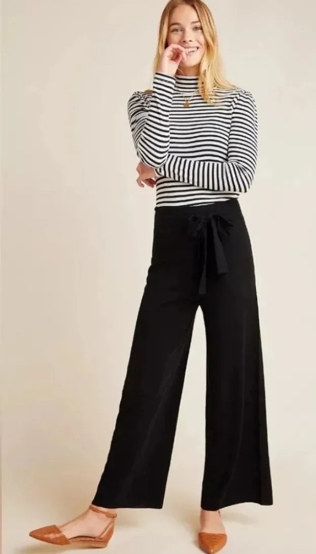 Moth by Anthropologie black wide leg knit pants with a flattering tie waist. These comfortable and s... Show more