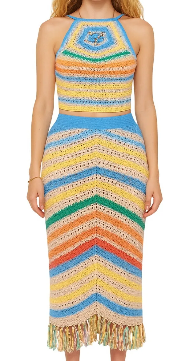 Condition: Brand new with tags. Details: Rare and stunning two-piece crochet set from Mother in the “Candy Stripe” pattern. Features a cropped halter tank with a cinched tie-back, openwork floral motif, and a coordinating high-waisted midi skirt with a thick waistband and fringe hem. Made from 100% cotton in cream with rainbow stripes—perfect for festivals, beach vacations, or boho summer styling. Originally retailed for $710 ($325 top + $385 skirt). Top – Bust 13.5 in flat (27 in full), length 17.5 in from shoulder to hem. Skirt – Waist 13 in flat (26 in full, stretchy), length 36 in. All measurements approximate and shown in photos. Ships within 2 business days from a smoke-free home. All sales final. mother, motherdenim, crochet, fringe, boho, festival, tropical, summer, resortwear, beach, 70s, flowerpower, hippie