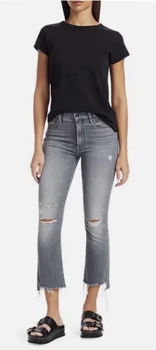 FEATURES Fits true to size, order your normal size High rise: 10.25" Cropped inseam: 26" Leg opening: 15" All measurements based on a size 26 Model measurements: 5'10" height, 33.5" bust, 23.5" waist, 34.5" hips, wearing a size 26 Zip fly with button closure, five-pocket silhouette Tonal stitching, dark silver-tone hardware, belt loops Faded, whiskered, distressed Flare-leg silhouette, frayed step hem Made in USA MATERIALS & CARE 98% cotton/2% elastane Machine wash