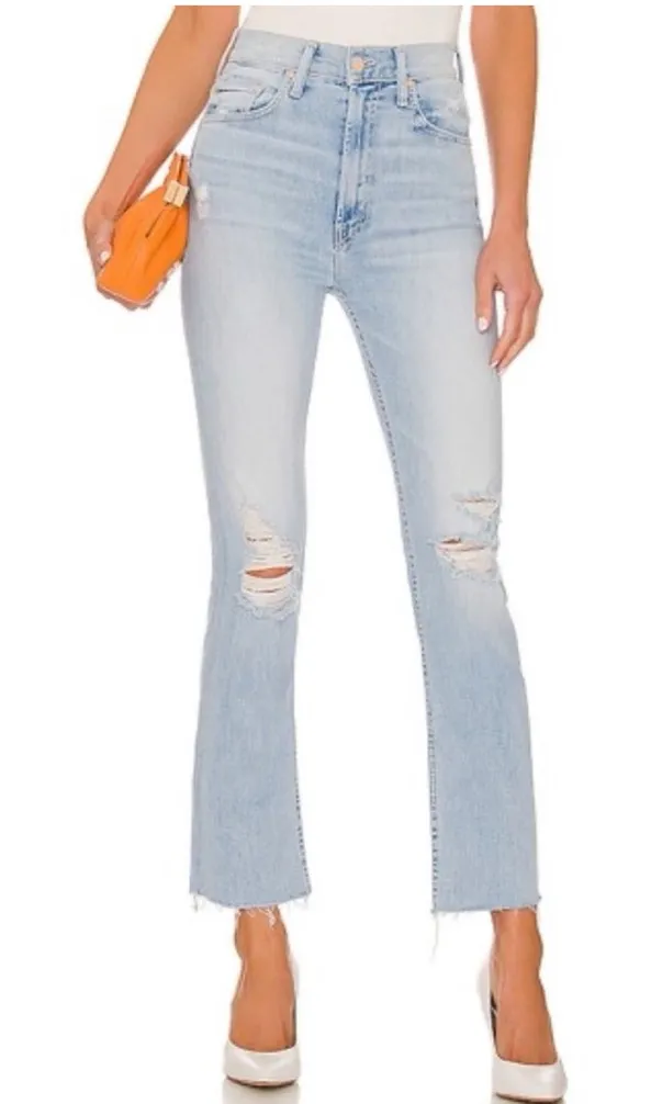 MOTHER HIGH Waisted Rider Ankle Fray Island After Hours Jean Size 26 Great condition. No rips, stains or flaws. Gently worn. Zip fly with button closure, five-pocket silhouette Contrast stitching, gold-tone hardware, belt loops Faded & whiskered, distressed, ripped at knees Light blue wash, flare-leg silhouette, frayed hem Imported 92% cotton/6% polyester/2% elastane High rise: 11.75", 27 inch inseam
