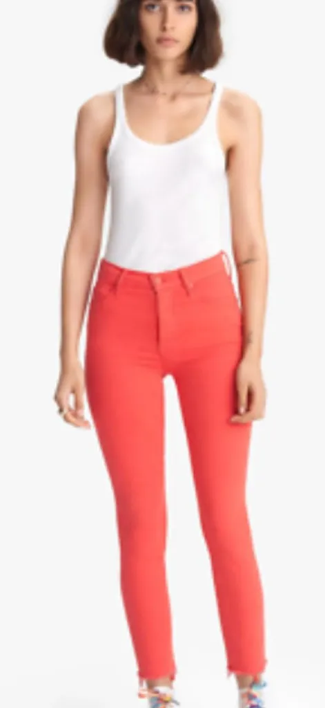 Waist: 14.5" across Inseam: 28" Condition: Gently worn, no visible flaws Color: Bright red/orange (Play Date wash) Style: The Stunner Ankle Fray with cropped, raw frayed hems Material: 94% cotton, 4% polyester, 2% elastane Five-pocket design with button and zip closure High rise skinny fit, ankle length with frayed hems Mother leather patch on waistband, made in the USA Tag size: 27 (Womens) Machine wash cold, tumble dry low, or dry clean