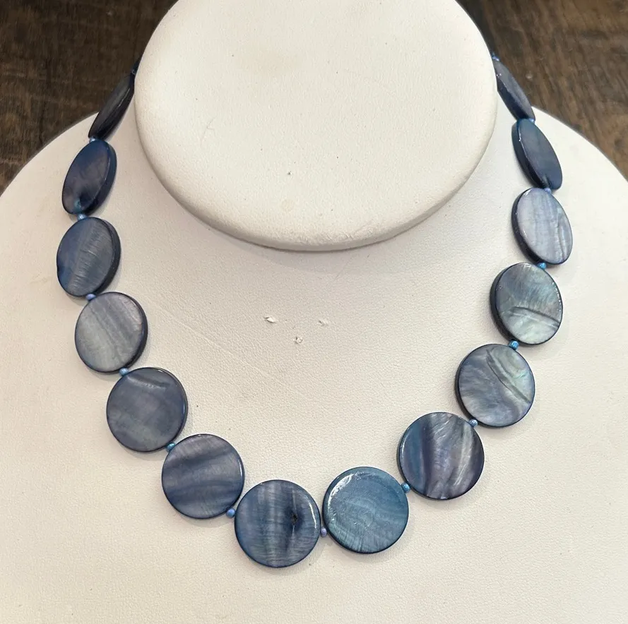 This stunning necklace features smooth mother of pearl disc beads in soft shades of Lilac w/Purple and Blue Tones, accented with Light blue/ purple tone spacers for a touch of sparkle