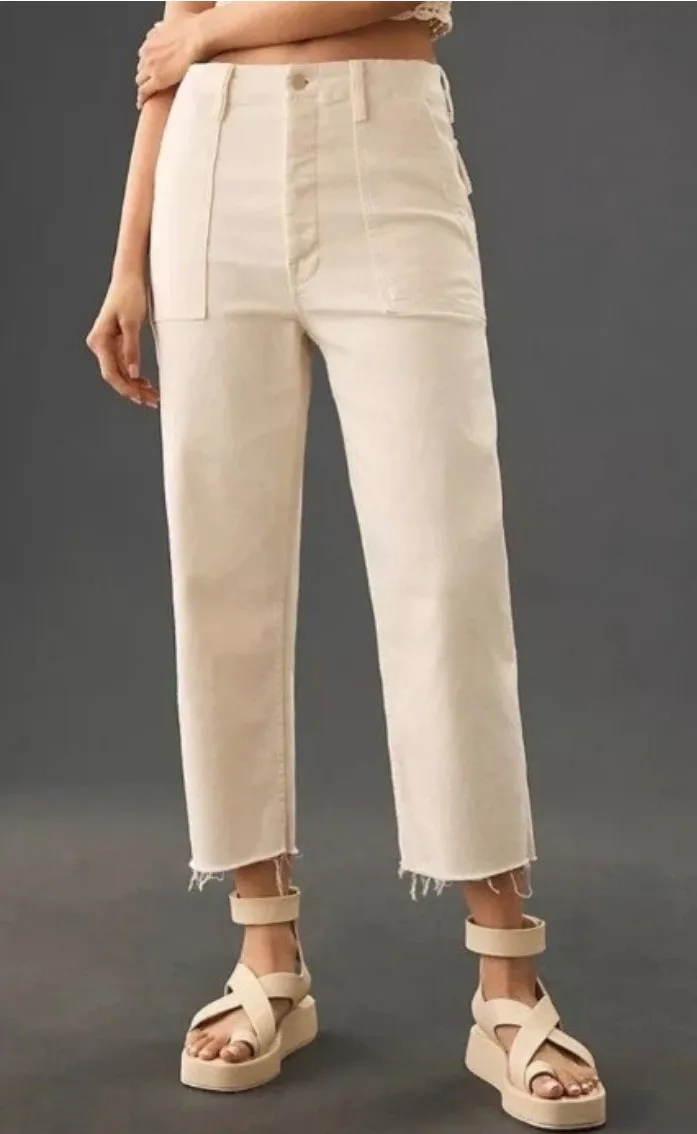 MOTHER Patch Pocket Private jeans in a creamy off-white hue. These pants feature a flattering high-rise fit with a straight leg silhouette and a raw, frayed ankle hem. The front is detailed with patch pockets and a button fly closure. The back showcases two button flap patch pockets. Perfect for a casual day out or a relaxed weekend brunch. A couple tiny spots- has not been spot treated. Measurements: • Inseam: 24 in • Waist flat: 13 in • Rise: 12 in Style: Cropped Department: Women Fabric Wash: Cream Puffs Waist Size: 26 in Type: Jeans Accents: Fringe, Button Features: Distressed, Crop Fit: Relaxed Pattern: Solid Rise: High (Greater than 10.5 in) Fabric Type: Denim Inseam: 24 in Material: Cotton Closure: Button Season: Spring, Summer, Fall Keywords: mother jeans, patch pocket, frayed hem, cream denim, high rise, straight leg, button fly, ankle crop, designer denim, casual wear, weekend style, everyday denim, utility pants