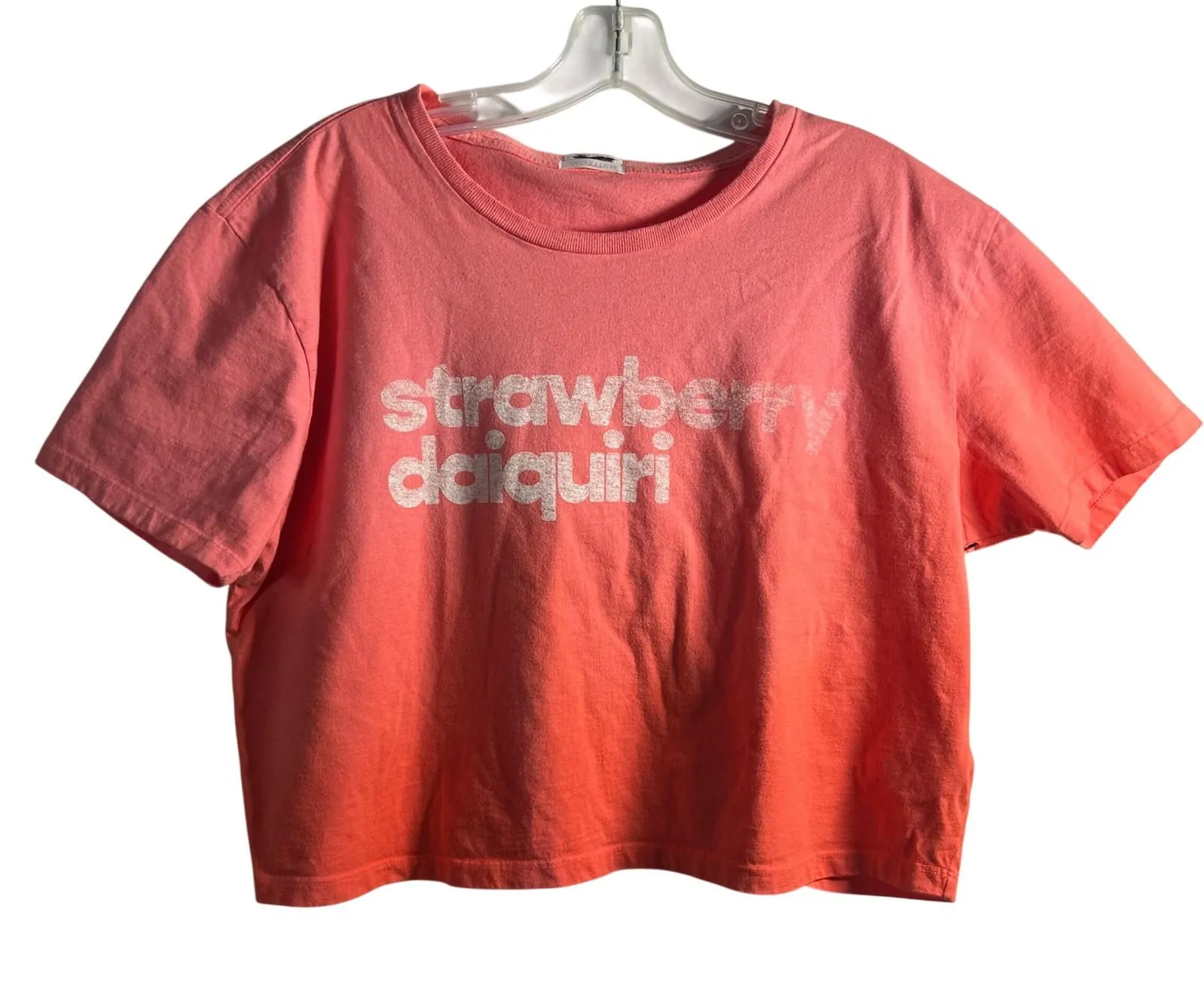 A cropped t-shirt with an ombre effect and "Strawberry Daiquiri" graphic. This top features a classi... Show more