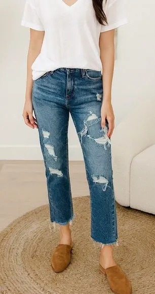 size 24. Iconic MOTHER denim in the coveted The Sinner straight-leg silhouette. These premium designer jeans feature a perfectly lived-in light wash, subtle distressing, and a relaxed, effortless fit that MOTHER is known for. A timeless, cool-girl staple that pairs seamlessly with tees, knits, and blazers. • Size 24 (relaxed fit, can accommodate up to approx. size 27) • Straight leg / vintage-inspired fit • Distressed detailing for a worn-in look • Zip fly closure • Premium stretch denim • Color: Ice Cream You Scream (light blue wash) • Smoke-free home Measurements (laid flat): Waist: 16” | Rise: 10” | Inseam: 25” | Length: 36” | Hip width: 14.5”