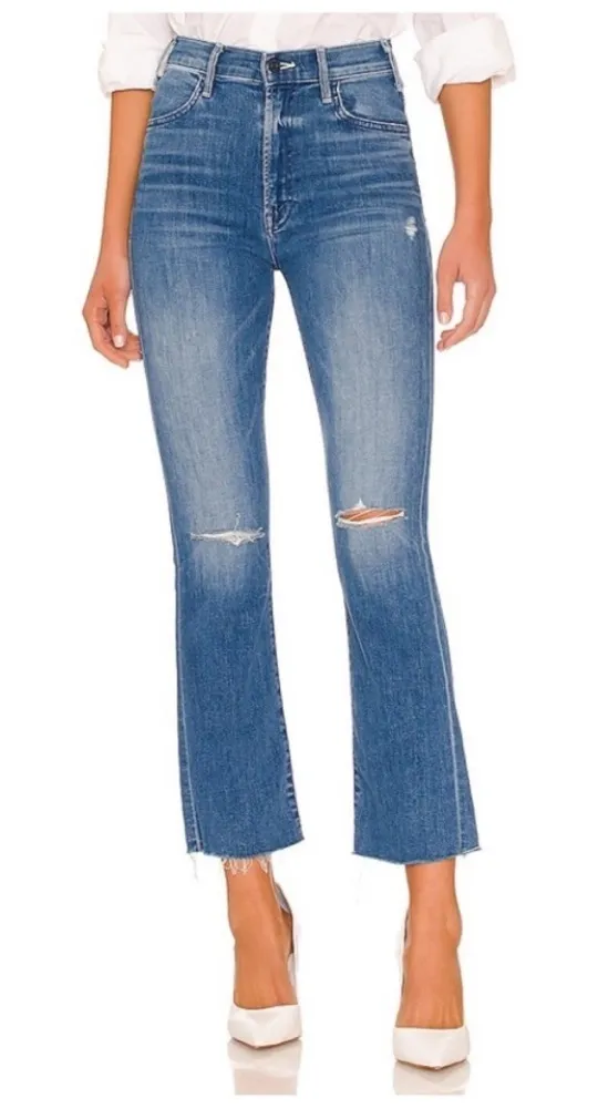 94% cotton, 5% polyester, 1% elastane. Made in USA. Machine wash. Zip fly with button closure. 5-pocket design. Light fading and destroyed detail. Frayed raw-cut hem. 12" at the knee breaks to 14" at the leg opening. Inseam 27.5 in Revolve Style No. MOTH-WJ1213. Manufacturer Style No. 1117-104. Size 26 EUC