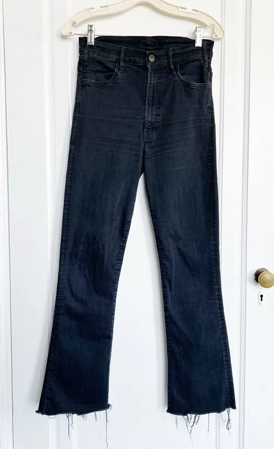 Fabulous cropped flare jeans by Mother Denim. “The Hustler Ankle Fray” style in "Not Guilty" (a washed/faded black) stretch denim. Waist 27-29“, rise 11.5“, inseam 27“. Size 27, good preowned condition w some overall wash wear as well as some puckering at crotch/thigh and wear spot at crotch (see photos, not visible when worn). This style is still retailing full price! From the MOTHER website: "Plead the fifth. These bestselling high-waist flare jeans have an ankle-length inseam and a raw hem. Made from stretch denim, Not Guilty is our bestselling black wash. 92.5% Cotton 5% Polyester 2.5% Elastane"