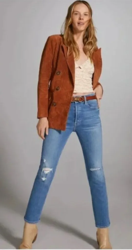 Excellent, like new condition Bestselling high-rise straight leg with a button fly and an ankle-length inseam. Cut from comfortable stretch denim. Play Like A Pirate is a weathered mid blue wash with whiskering, fading, and rips at the knees. 26" inseam; 14" leg opening; 11" front rise; 13 1/2" back rise (size 29) Button fly 78% cotton, 16% modal, 4% polyester, 2% elastane Brand: Mother Color: Blue Size: 29 Condition: Excellent like new