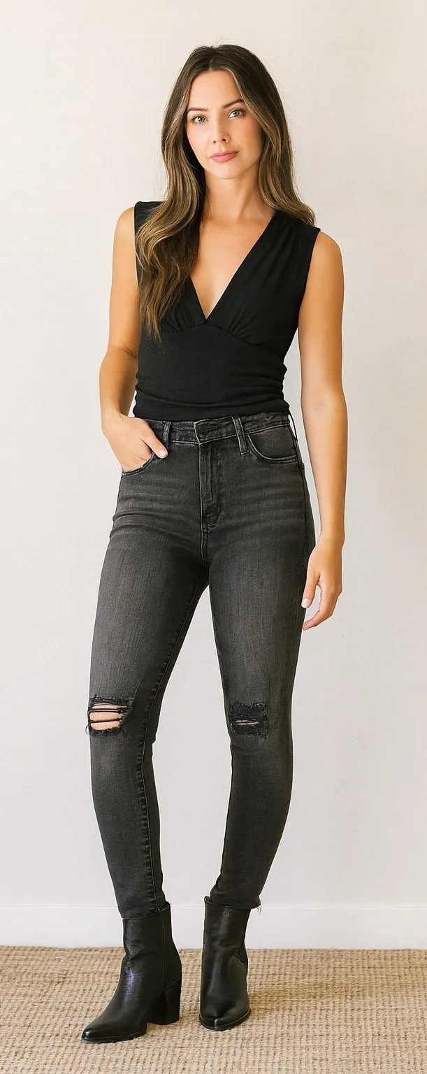 Features: Ankle-length skinny denim with distressed knees and raw frayed hem Mid-rise fit with stretch for comfort Classic five-pocket design Soft, broken-in feel 92.5% cotton / 5% polyester / 2.5% elastane grunge, Y2K, streetwear, edgy, minimalist, casual chic, trendy Condition: Excellent condition. No visible flaws. See all photos for details. Approx. Measurements (taken flat lay): Waist: 14" Rise: 10" Inseam: 27" Outseam: 37" Ships next business day. Bundle deals available. Smoke-free home. Please check measurements before purchasing. SKU 1073