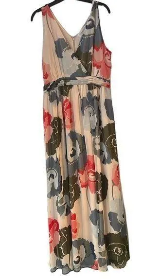 Flowy dress Worn once Fully lined Colors are ivory/cream, pink, green and blue—may vary from photos due to lighting Tie back waist Sleeveless Hidden back zipper with hook and eye closure 100% polyester Machine wash, lay flat to dry Approximate measurements: 18” pit to pit, 57” length