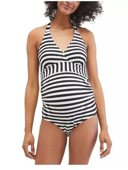 MOTHERHOOD MATERNITY Beach Bump™ Striped Halter One Piece Maternity Swim Sz XL + Black - $22 - From Melissa