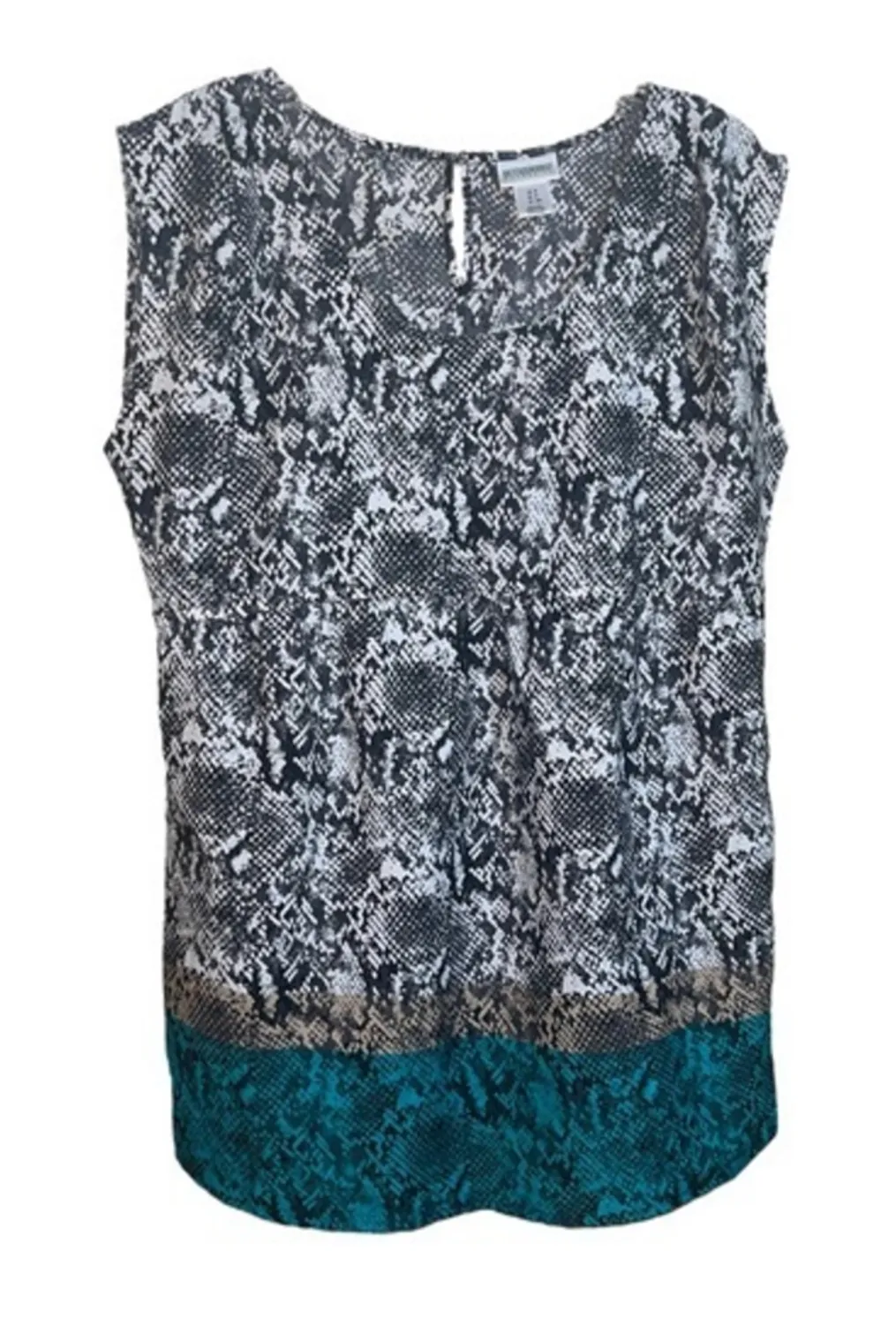 Excellent pre-owned condition Black, White, Gray, Tan, Teal 100% polyester Measurements (lay flat) Chest 20.5” Back Length 27.5” Waist 18” Bottom hem 22” Measurements are approximate Color may vary depending on screen settings or lighting I consider all reasonable offers FAST shipping Smoke-Free and Pet-Free Home Tags: Maternity Mother Pregnancy Pregnant Sleeveless Animal Print Reptile Snake Croc Alligator Work Career Business Lightweight Layer Multi Color