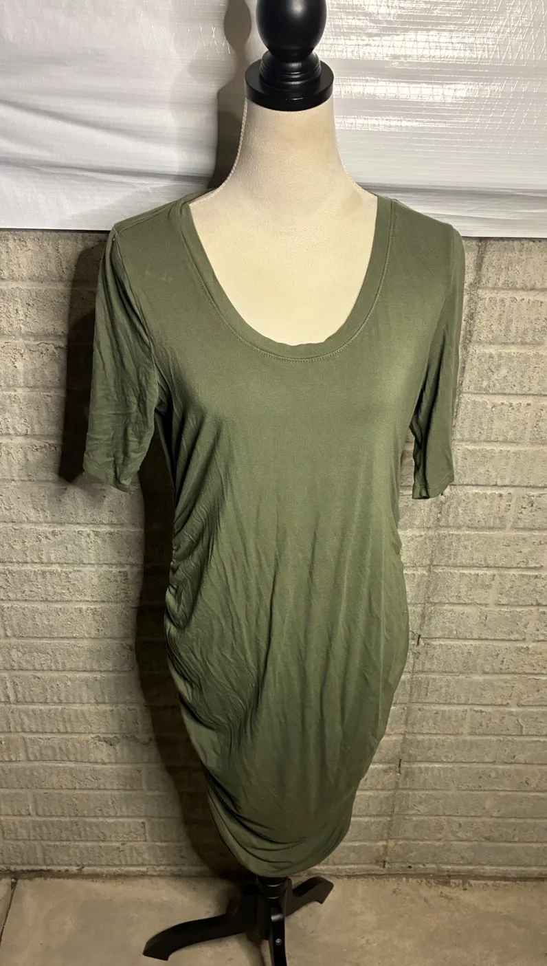Embrace effortless style and comfort with this charming olive green t-shirt dress. The soft, flattering silhouette drapes beautifully, while the ruched detailing along the side accentuates your shape and provides a comfortable fit. Perfect for a casual day out, a relaxed brunch with friends, or even as a comfortable yet chic option during your pregnancy journey, this versatile dress will quickly become a go-to in your wardrobe. Style: T-Shirt Dress Dress Length: Knee Length Department: Women Sleeve Length: Short Sleeve Pattern: Solid Occasion: Casual Material: Cotton Blend Fabric Type: Jersey Neckline: Scoop Neck Season: Spring, Summer, Fall Sleeve Type: Cap Sleeve Closure: Pullover Keywords: Motherhood Maternity Dress, Olive Green Dress, Ruched Side Dress, T Shirt Dress, Maternity Dress, Casual Dress, Comfortable Dress, Women's Dress, Knee Length Dress, Short Sleeve Dress, Everyday Wear, Versatile Dress, Maternity Fashion