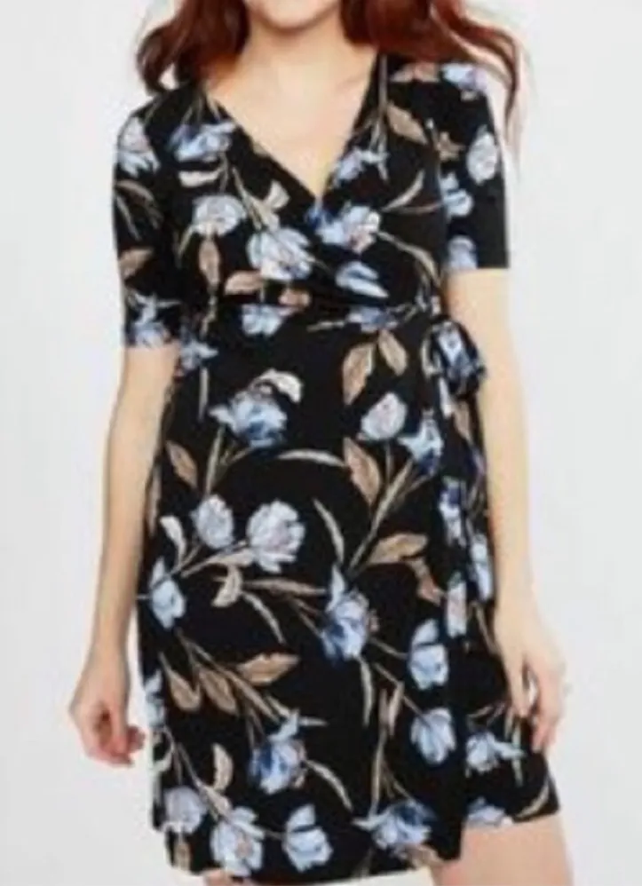 Motherhood Maternity Floral Faux Wrap Black and Blue Floral Dress Size Large Slinky Material. Size:... Show more