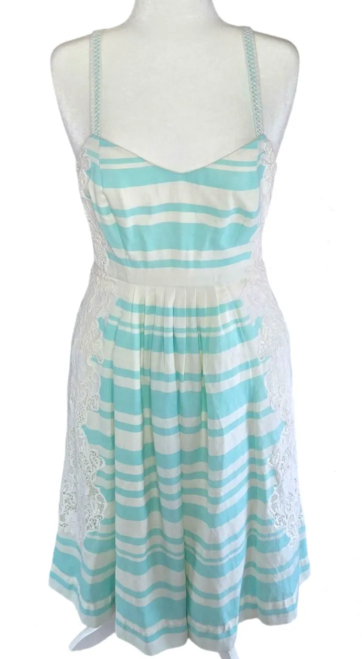 Moulinette Soeurs Blue White Striped Lace Dress Brand: Moulinette Soeurs by Anthropologie Size: 6 Style Name: None Color: Blue and White EUC Charming and feminine Classic stripes with romantic lace insets Flattering fit-and-flare silhouette Adjustable straps Full lining Perfect for spring and summer occasions Sweetheart neckline with adjustable spaghetti straps Vertical lace insets on sides for a flattering shape Concealed back zip closure Midi length with a full, softly pleated skirt Perfect for weddings, brunches, garden parties, or just feeling pretty on a sunny day Armpit to armpit: 15.5" Top to bottom: 43" Waist: 13.25" Shell: 50% Polyester, 19% Rayon, 31% Linen Lace Insets: 100% Cotton Lining: 100% Acetate Smoke-free home **All measurements are taken laying flat using a fabric measuring tape. Please note that these measurements are approximate based upon my measurements.