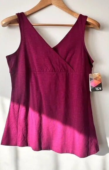 This Mountain Hardwear Tank Top in size M features a V-Neck neckline and pullover closure, making it easy to wear for various occasions such as travel, activewear, or casual outings. The fuchsia pink color adds a pop of brightness to the wardrobe. Made from a lightweight knit fabric blend of Spandex, Cotton, and Modal, this sleeveless top is designed for athletic activities with a wide strap design and chest compression area for a comfortable fit during activities like walking, yoga, running, and more. Measurements chest pit to pit 16.5 inches across Length 25.5 inches