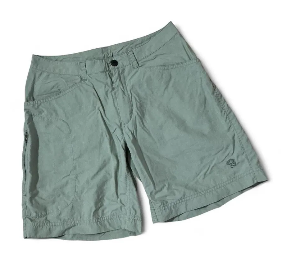Mountain Hardwear women's outdoor hiking shorts in a versatile sage green. These shorts feature a comfortable mid-rise fit with a button and zip closure. Practical design includes front pockets and a zippered side pocket for secure storage of essentials. The durable yet lightweight fabric makes them ideal for active pursuits. Perfect for hiking, camping, or casual outdoor adventures. Keywords: outdoor apparel, athletic shorts, travel clothing, adventure gear, quick dry, zipper pocket, mid rise, performance wear, trail ready, summertime, activewear #Activewear #Athleisure