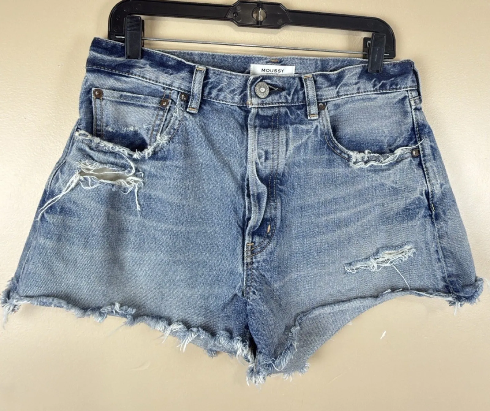 Vintage Moussy jeans, size 28, made in Japan from 100% high-quality cotton. They feature a Medium blue wash with distressed and ripped details on the front and back, and a raw, frayed hem that adds a modern, casual touch. Perfect for a stylish, urban look.