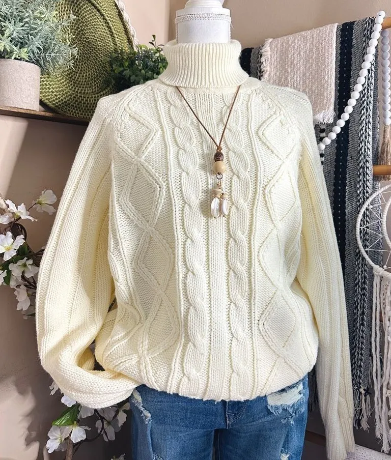 Step back in time with this vintage 70s/80s Sigallo chunky cable knit turtleneck sweater! Expertly c... Show more
