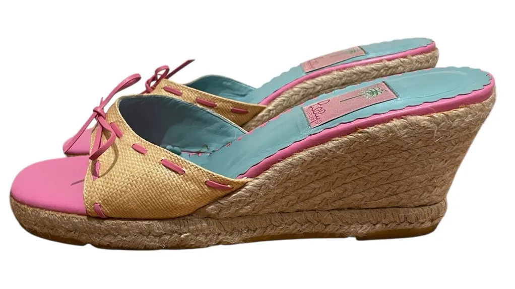 Vibrant Lilly Pulitzer Relay wedge sandals in Hibiscus pink with woven straw upper, pink leather bow... Show more