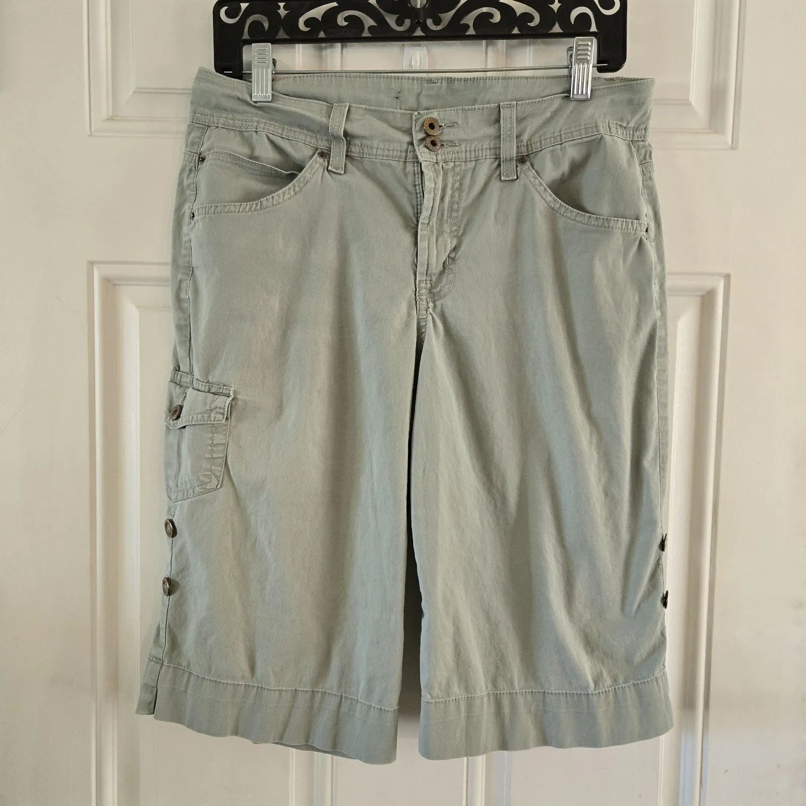 Bandolino womens Bermuda shorts in size 6. Crafted from soft cotton with a light sage green tone. Missing a button on back pocket. Convertible design wear them long or roll up and secure with the side button tabs for a shorter look. Utility style side cargo pocket with button flap plus front and back pockets. Double button waistband with belt loops for a secure, flattering fit. Casual versatility perfect for everyday wear, travel, outdoor activities, or relaxed weekends. Rise 9.5" Waist 31" Inseam longest setting 13"