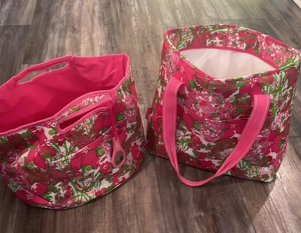 Pink floral insulated drink tote bag External pocket Preowned Inner snap loop has some rust Lined... Show more