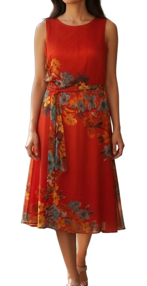 Bold, vibrant, and effortlessly elegant—this MSK blouson maxi dress features a striking red floral print with rich accents of orange, teal, golden yellow, and grey. Sleeveless silhouette with a flowing blouson bodice, elastic waistband, and self-tie belt to define the waist while maintaining comfort. Fully lined with a keyhole back button closure for a polished finish. Ankle-length hem makes this a standout for weddings, garden parties, summer events, or elevated daytime occasions. Crafted from lightweight 100% polyester, this dress drapes beautifully and wears comfortably. Excellent preowned condition from a smoke-free home. Flat lay measurements: Pit to pit: 17” Waist: 13” (unstretched) Length: approx. 47” Size 8. Model shown for fit reference only. MSK maxi dress, red floral dress, blouson maxi, belted sleeveless dress, wedding guest dress, garden party outfit, summer formal #MSKDress #FloralMaxi #BeltedDress #SleevelessDress #BohoStyle #SummerFashion