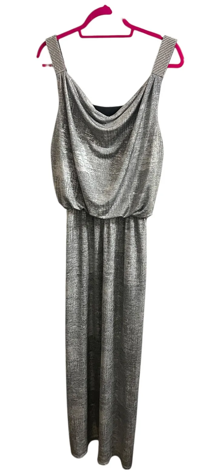 Very small pull/snag. Tried to capture in photos Slit Polyester blend Colors may vary by device. Measurements: Approximate and taken while hanging. Pit to pit 18 inches Length 60 inches AI model used to illustrate possible fit and look