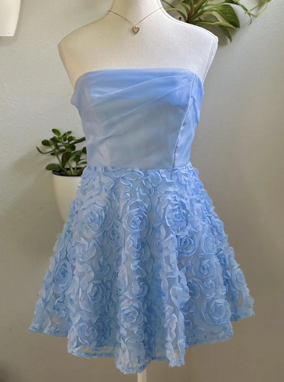 Absolutely stunning Angel Biba strapless mini dress in a dreamy pastel blue. The bodice features soft ruched detail and a corset lace-up back, giving a secure and adjustable fit. The standout feature is the skirt covered in 3D rosette appliqué, adding a textured, romantic touch. Perfect for prom, graduation, cocktail parties, or any special event. Details: • Brand: Angel Biba • Size: US XS / AU 6 • Fabric: 100% Polyester • Color: Light blue • Strapless design • Corset lace-up back • Mini length • 3D rosette skirt detail
