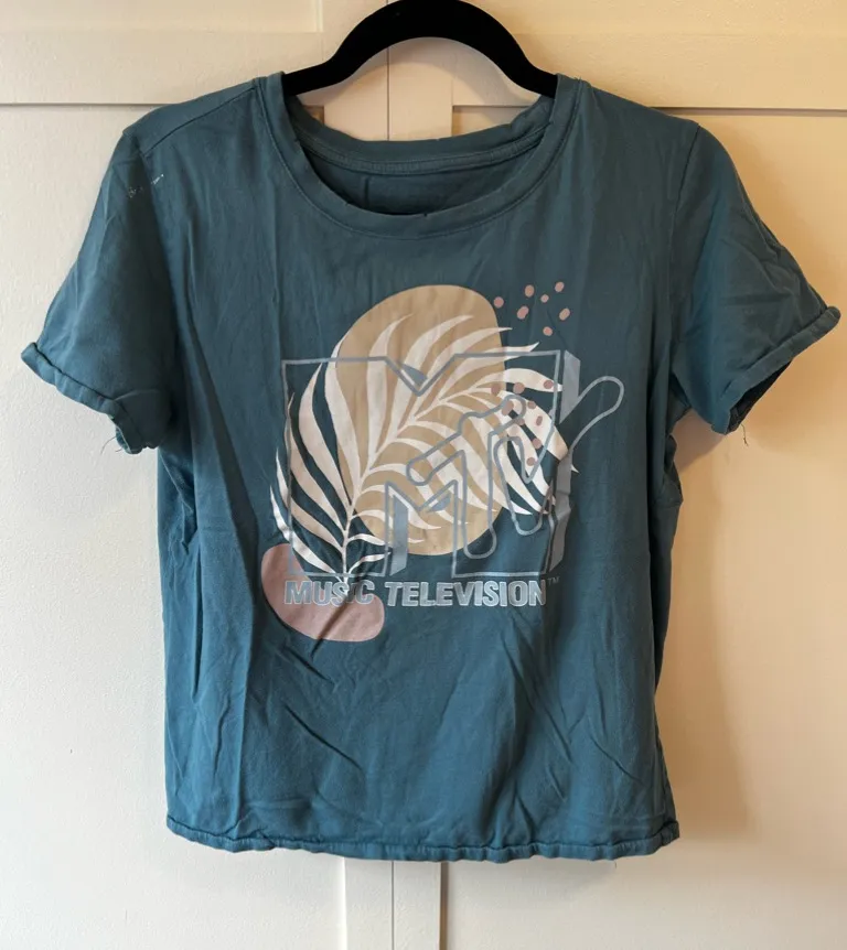 Women’s MTV t shirt -size XS -blue tee shirt with palm leaf -muted earthy neutral colors -purposefu... Show more