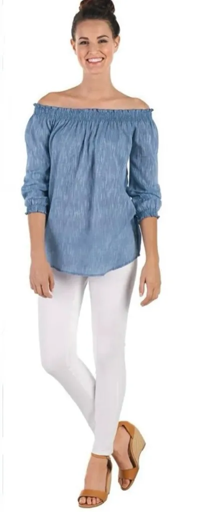 Mud Pie Foster Off-The-Shoulder Slub Chambray Top in size Small. This lightweight, airy blouse features an elasticized neckline that can be worn fully off the shoulder or slightly draped, plus 3/4 puff sleeves with gentle elastic cuffs. The slub chambray fabric gives it a textured, soft-denim look while keeping it breathable and comfortable. Perfect for warm weather, weekend outfits, beach trips, or pairing with white denim for a polished coastal-chic style. Easy, relaxed, and flattering on many body types. • Size Small • Off-the-shoulder neckline • Lightweight slub chambray fabric • 3/4 elastic-cuff sleeves • Relaxed fit • Pullover style • Length-23” This top is in excellent condition chambray top, off shoulder blouse, summer boho, lightweight top, slub chambray, 3/4 sleeve blouse, blue peasant top, Mud Pie top, resort style, casual chic, coastal style, soft denim look, feminine blouse, warm-weather top, spring summer staple