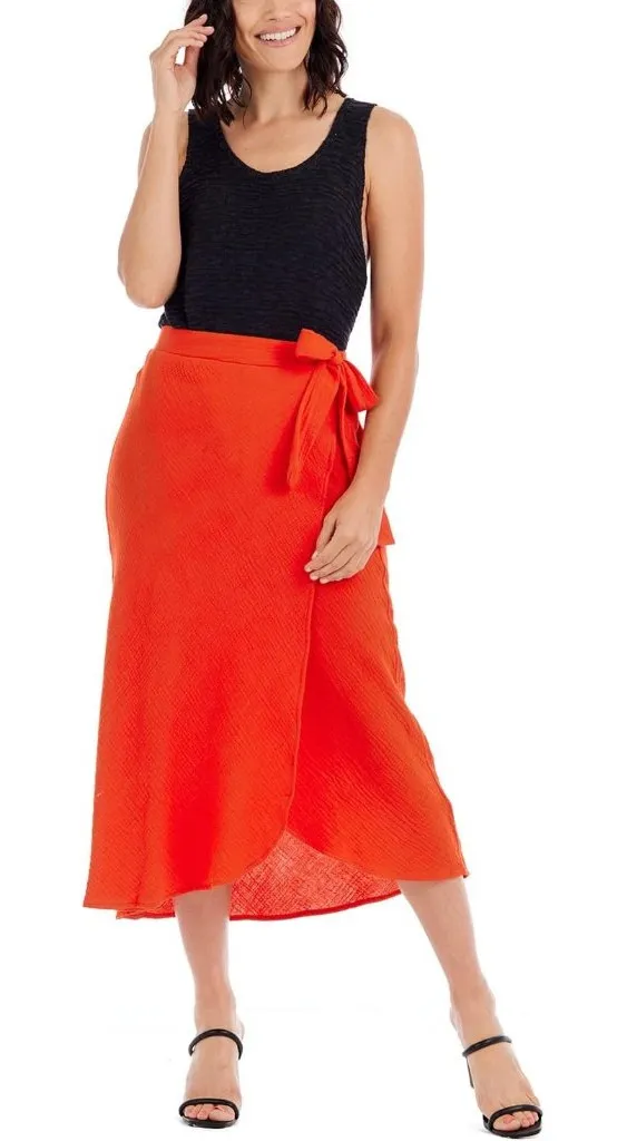 This vibrant red-orange midi skirt features a pull-on style with an elastic waist for comfort. The g... Show more