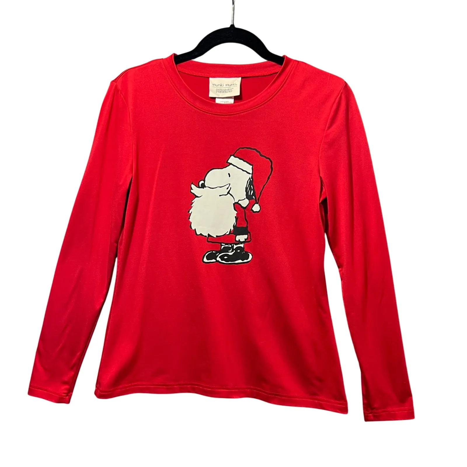 Munki Munki Peanuts long sleeve red t-shirt with a Snoopy graphic wearing a Santa hat. This festive top features a comfortable crew neckline and long sleeves, perfect for holiday cheer. Keywords: Peanuts, Snoopy, Santa, Christmas, Holiday, Festive, Long Sleeve, Red, Graphic Tee, Loungewear, Casual, Winter, Comfy Note: All items are pre-owned with minor wear expected. Major flaws shown. Measurements are approximate.