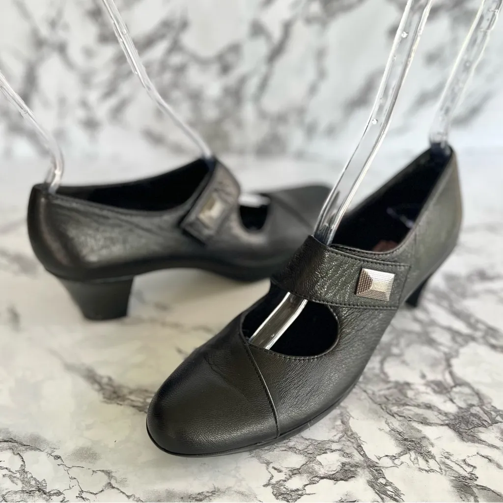 Munro Leann Black Mary Jane Heels These are super slim width. Details: ~ leather upper ~ Mary Jane style with Velcro strap ~ silver-tone detail on strap ~ natural latex shock resistant sole ~ removable contoured footbed ~ stacked heel, minor marks on one heel, see pics Size: 8.5 SS (super slim) Heel height: 2 1/4”
