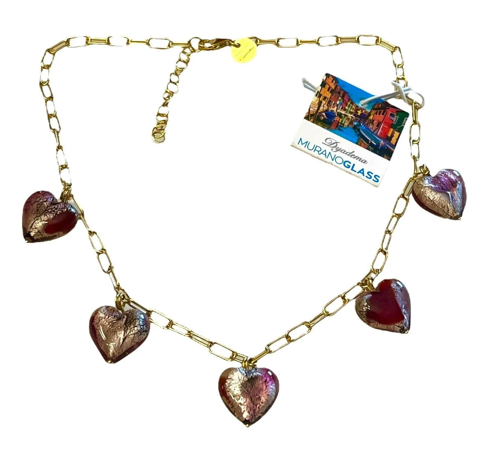 You Are Looking To Buy: NEW Murano Glass Hearts Necklace Silver Foil & Multi Color Venetian Glass Dyadema Made In Italy- New With Tags In Box! Details: Beautiful Italian Murano Glass Hearts Dangle From This Gold Tone Paperclip Necklace! 17” Adjustable Necklace With (5) Murano Glass Hearts 3/4” Each! Features Silver Foil In Murano Glass Multi Color Swirls New with Tags In Box! Great Gift for Him or Her - or For Yourself! Thank You!