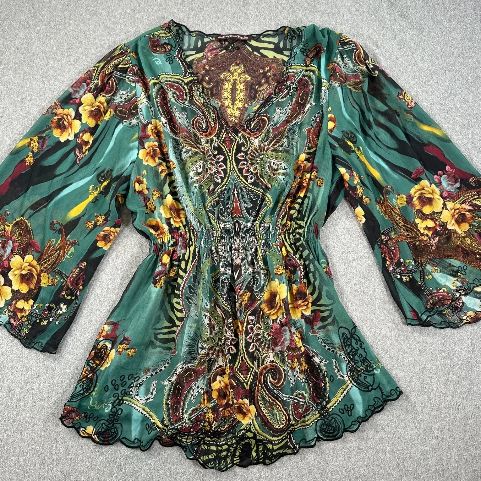 Size: No Size Tag, Fits like a large in my opinion - please compare measurements to a blouse you already own for best fit. Condition: No Size Tag, Very Good Pre-Owned Condition, No Rips,Stains, or Tears.Please see all photos for most accurate representation of condition Color: Green, Yellow Floral Closure: Pullover Pockets: No Material: 100% Polyester Sleeve Length: Long Sleeve