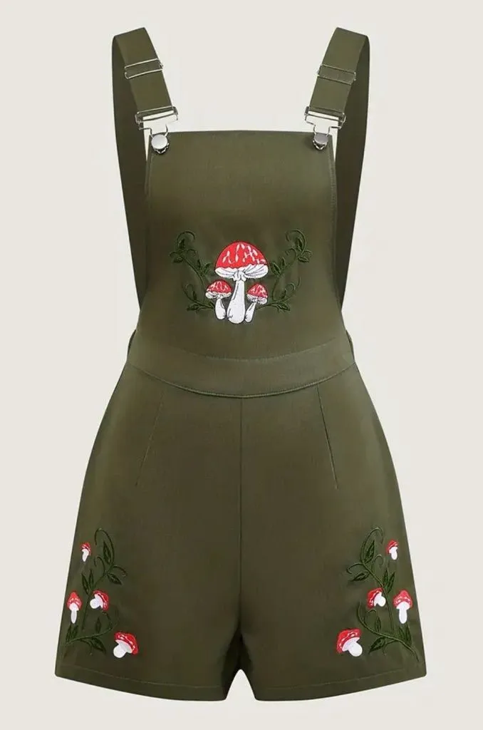 Brand new with tags size Large olive green overall-style jumpsuit featuring a striking red and white mushroom embroidered design on the chest and matching vine mushroom embroidery on both legs. Adjustable shoulder straps with silver hardware let you dial in the fit instead of being stuck with whatever the factory decided. Wide-leg silhouette gives a relaxed, modern drape while the woven polyester fabric keeps this lightweight enough for spring through fall. This is a playful statement piece—festival, cottagecore, or layered with a tee for everyday casual. If you’re into earthy bohemian looks, this fits the bill without trying too hard. Details • Condition: NWT – New With Tags • Label Size: Large • Fabric: 100% polyester woven • Adjustable straps • Side pockets • Wide leg / loose fit • Waist: approx 31.5” • Hips: approx 48.1” • length: approx 33.1” • Inseam: approx 3.3” mushroomcore, cottagecore, bohemian, festival, retro, whimsical, earthy, nature inspired, folk, garden, forest, fairycore, granola girl, indie, relaxed fit, wide leg, artisanal, prairie aesthetic, Stevie Nicks vibe, vintage inspired, eclectic, woodland, spring outfit, summer outfit, fall layering, statement romper, cute overalls, playful embroidery