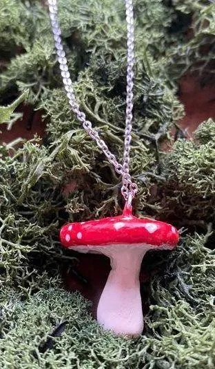 Handmade by my daughters mushroom necklace made with air dry clay ❤️ 1.5mm Cable Chain Necklace, 18" with 2" Extender Chain and Lobster Clasp, Stainless Steel Chain Hand painted One of a kind