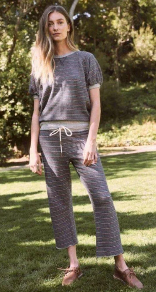 THE GREAT. Loungewear Set: The Puff Sleeve Sweatshirt. + The Wide Leg Cropped Sweatpant. Print: Navy Colorful Stripe Size: 3 = Large (12-14) New with Tags We tweaked the sleeves of our favorite short sleeve sweatshirt for a more feminine fit. Wear with everything from skirts to jeans to sweats. This Wide Leg Sweatpant has the most perfect wide, cropped leg and drawstring waist. Pair with your favorite tees and sweatshirts. Novelty Print Made in the USA 97.5% Cotton 2.5% Rayon Machine Wash Approximate Measurements: Top: Pit to Pit 24" Sleeves 13" Cuffs 8" Back Length from Shoulder 25" Bottom: Waist 36" Front Rise 12" Inseam 24" Cuffs 20" Cozy Chic Matching Set Shabby Chic Loungewear Set Weekend Lazy Sunday Breakfast in Bed Netflix & Chill Country Girl Nostalgic In Nature Neutral Unique Print Instagram Photoshoot Comfortable