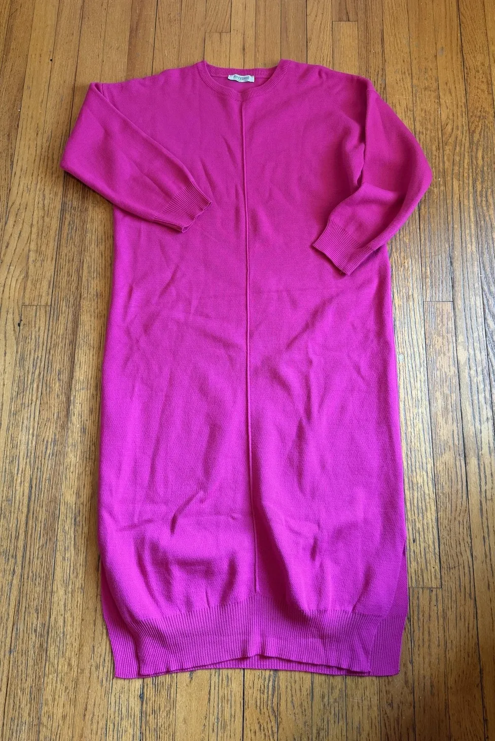 Brand: MY FASHION Style: Women's long sweater dress with crew neck and long sleeves in solid pink knit. Material: 100% acrylic; made in Türkiye. Size: One Size (standard); long sweater dress silhouette for casual everyday wear. Details: Pullover design, ribbed crew neckline, cuffs and hem, straight body with subtle center front seam, soft medium-weight knit ideal for fall and winter layering.