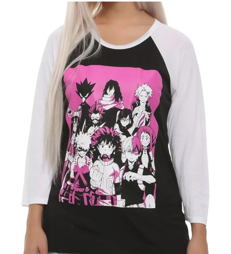 My Hero Academia Anime Graphic Raglan T-Shirt Black White Pink Manga Women Size Large Eye-catching... Show more