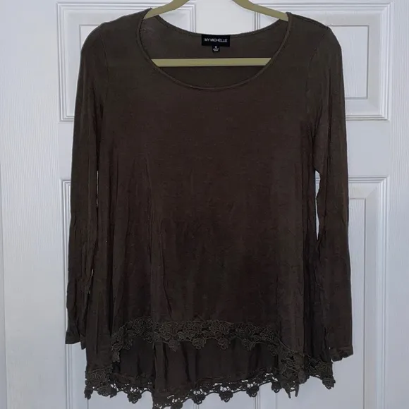 Women’s long sleeved olive green top with floral lace detailing along the bottom seam of the shirt.... Show more