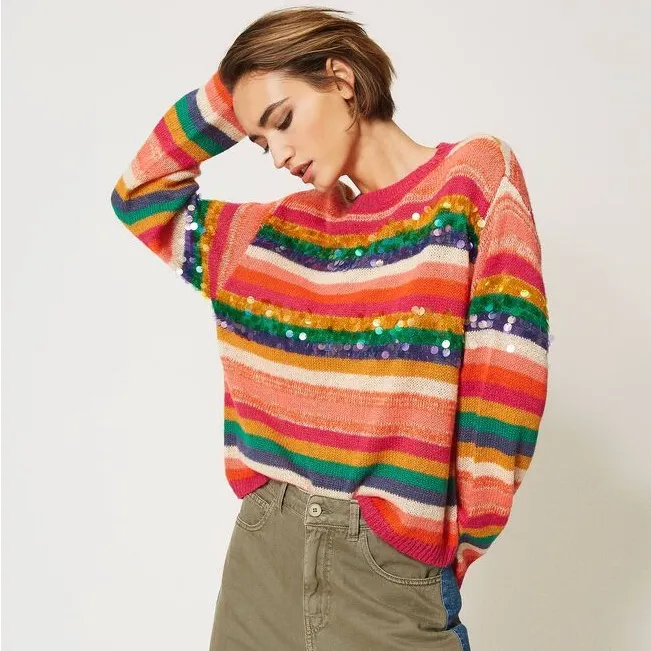 Gorgeous pre-loved My Twin by Twinset striped sequin sweater featuring bold rainbow colors, metallic... Show more