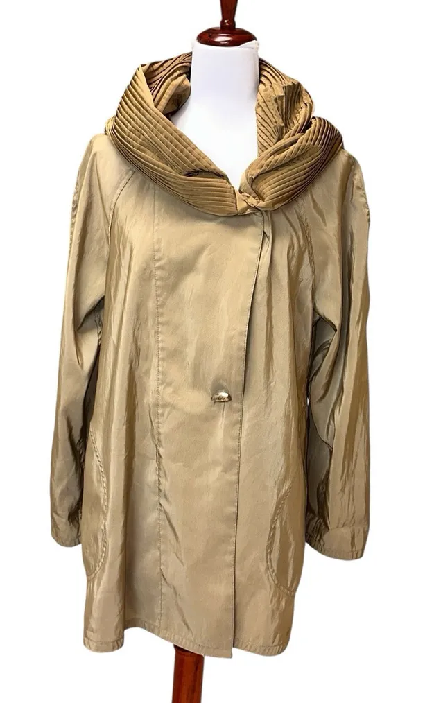 Reversible hooded vintage raincoat. Donatella short length. Tan on one side and golden tan ? On the other side On the tan side there are some spots. Once it’s flipped to the other side they don’t show. Small Length 29” Pit to pit 21” Sleeve length 27.5” Sleeves can be cinched in with buttons at ends.