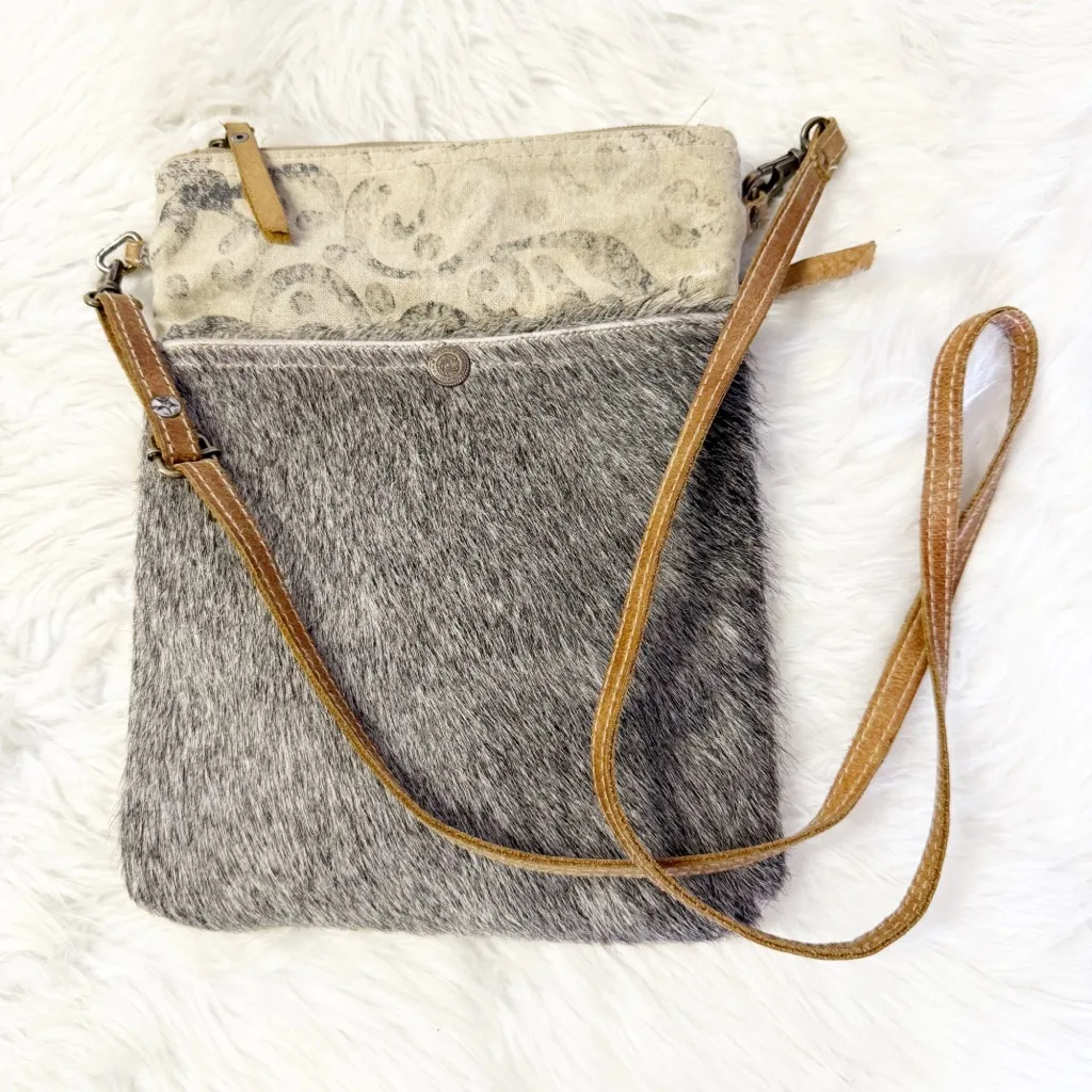 Condition: Pre-owned, very good condition Brand: Myra Bag Made in: India Description: Stylish Myra Bag crossbody featuring genuine hair-on hide cowhide with a neutral gray tone and canvas upper with a subtle paisley print. Western boho style with a slim, lightweight profile—perfect for everyday essentials. Features a zip-top closure, front snap pocket, and an adjustable leather crossbody strap with antique brass hardware. Each Myra Bag is unique due to the natural cowhide variation. Materials (per tag): • Outershell: 100% Cotton Canvas & 100% Leather • Innershell: 100% Cotton • Genuine hair-on cowhide front Approximate Measurements: • Width: ~8 inches • Height: ~10.5–11 inches • Strap: Adjustable crossbody length Features: • Zip top closure • Front snap pocket • Adjustable leather strap • Western / boho aesthetic • Lightweight and easy to wear Notes: Natural hide variations are normal and part of the design. ⸻ Search Keywords: Myra Bag, cowhide crossbody, hair on hide purse, western bag, boho crossbody, canvas leather bag, festival bag, western boutique, Myra cowhide purse