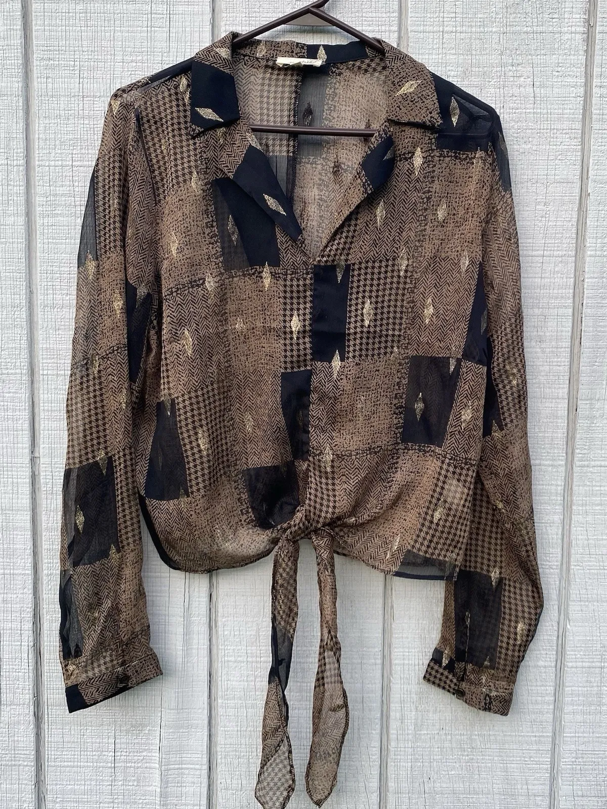 Mystree Brown Black Gold Anthro Blouse Tie Front Longsleeved Semi Sheer Medium - $12 - From Hannah
