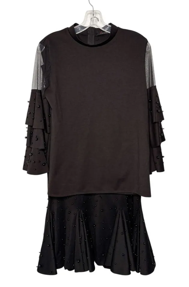 Excellent used condition. N By Nancy Black two piece skirts set. Layered ruffle sleeves with mesh at shoulders. Mermaid style midi skirt. Black pearl embellishment on skirt and sleeves. Has stretch. No rips or stains. Size a large. Approximate Measurements flat: Top L 24”, B 19.5”; Skirt W 16, Length from waist 33”. evening, black tie, going out, holiday, New Year’s Eve, formal, wedding, party