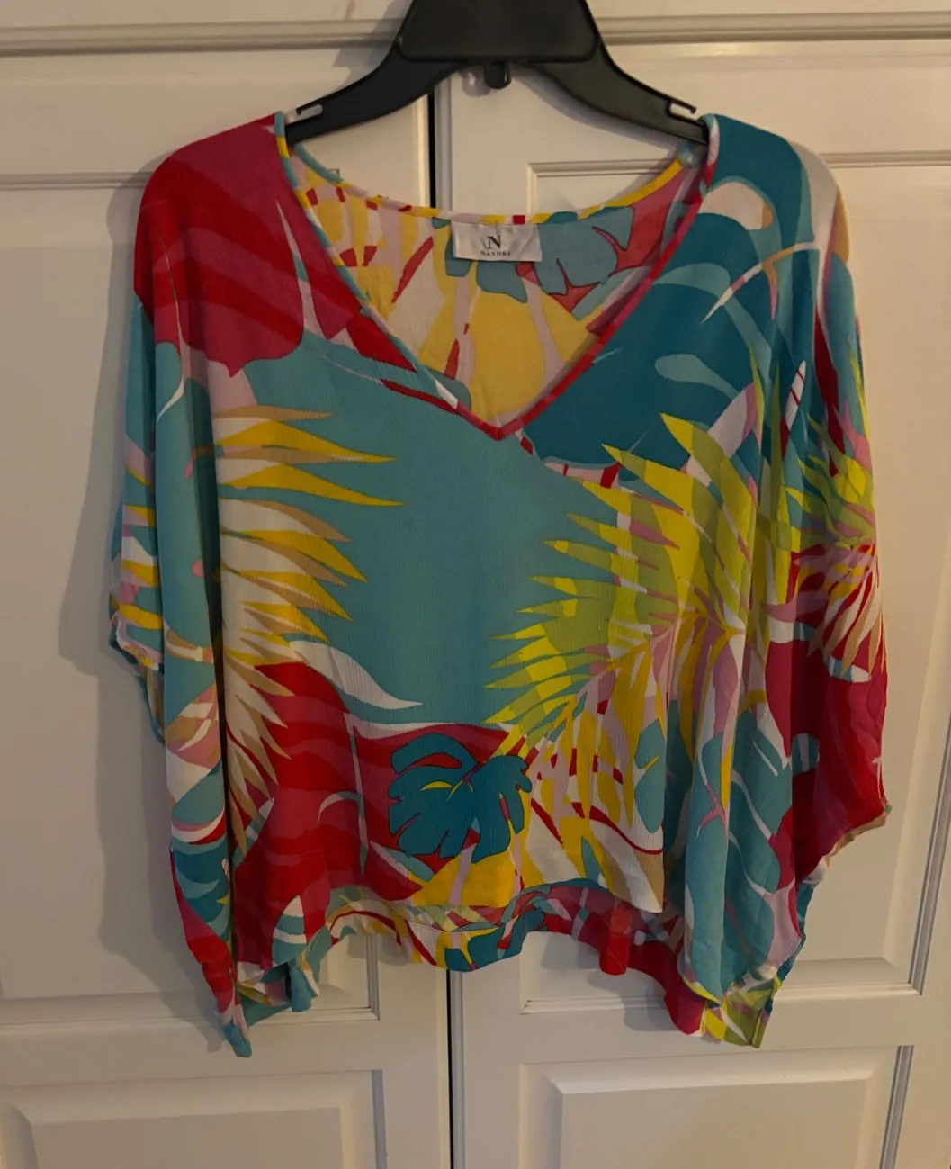 Brighten your wardrobe with this vibrant Natori poncho top, designed to evoke the feeling of a tropical escape. Its flowing silhouette drapes beautifully, creating a flattering and comfortable fit. The eye-catching print bursts with exotic foliage in a kaleidoscope of colors, making it a perfect statement piece for any occasion. Imagine yourself wearing this on a sunny beach vacation, a casual brunch with friends, or as a stylish addition to your resort wear collection. Measurements: • Pit to Pit: 35 in • Length: 23 Type: Blouse Department: Women Style: Tunic Material: Rayon Neckline: V-Neck Sleeve Length: Short Sleeve Sleeve Type: Kimono Sleeve Pattern: Floral Theme: Tropical, Colorful, Nature Features: Lightweight, Oversized, Stretch Fit: Relaxed Fabric Type: Rayon Occasion: Casual, Travel Closure: Pullover Keywords: Natori, poncho, kaftan, cover up, tropical print, resort wear, vacation, beachwear, oversized, flowy, boho, lightweight, summer fashion, statement top